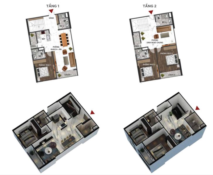 - Tầng 1: 60-120m² bao gồm phòng khách thông tầng, bếp ăn, 1 phòng ngủ, 1-2 WC, ban công